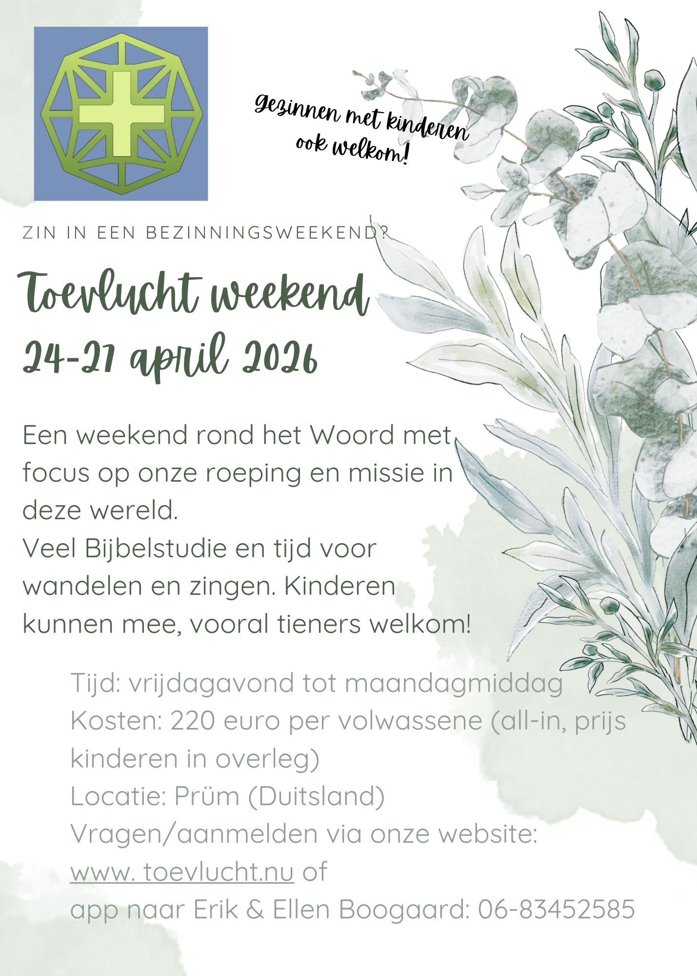 - Bijbelstudie weekend gezinnen: Als hierboven, maar dan samen met de kinderen. De kinderen volgen onder leiding van een kinderteam deels een eigen programma.