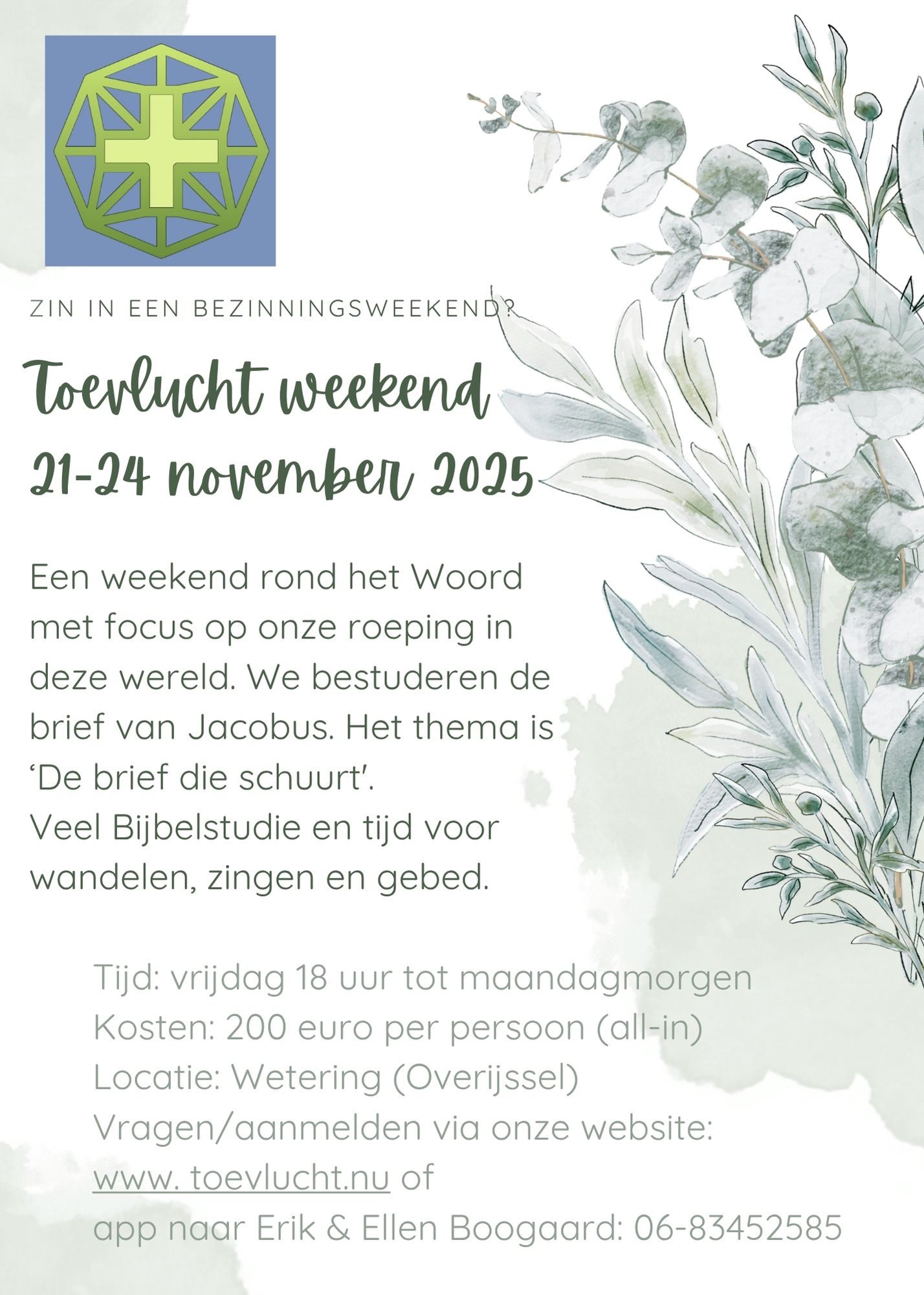 - Bijbelstudie weekend volwassenen: voor iedereen die zich wil verdiepen in een Bijbelboek en de praktische toepassing ervan in ons leven nu (eerstvolgende 21-24 november 2025)